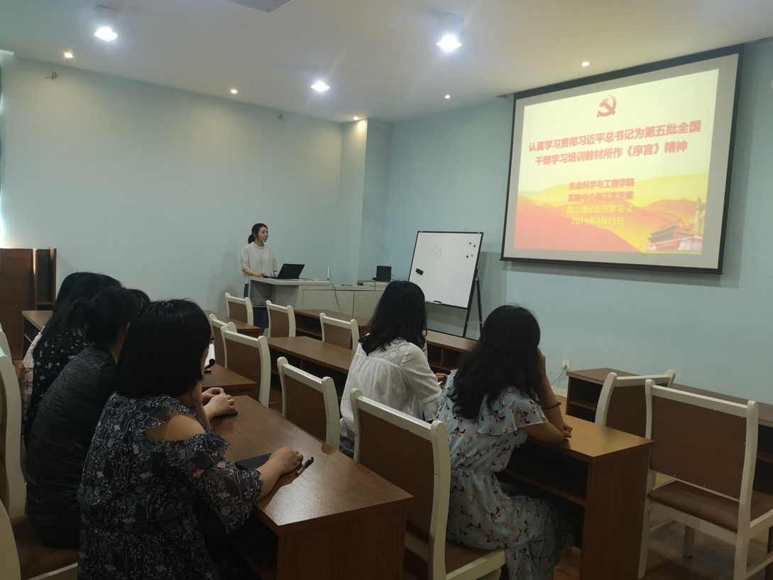 2019-04-264月25日下午,实验中心党支部在犀浦校区6502召开了“认真学习贯彻习近平总书记为第五批全国干部学习培训教材所做《序言》精神为主题的党日...