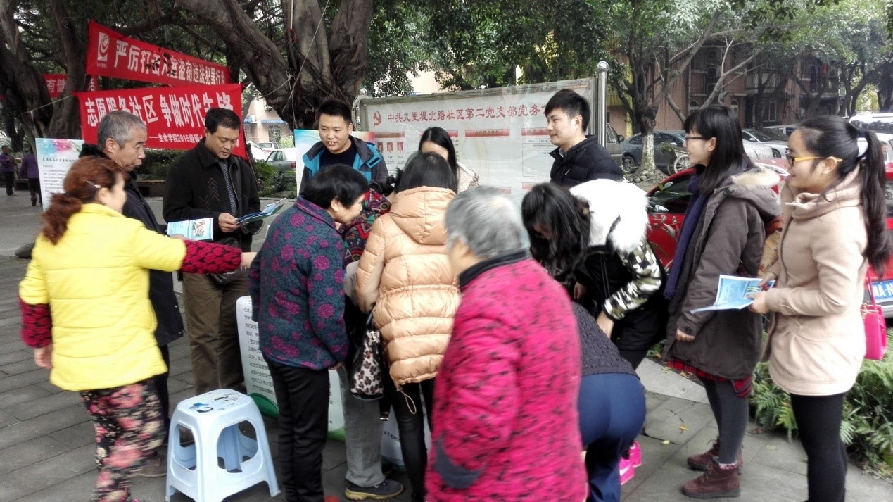 上午9:00活动正式开始。首先由党支部书记李祯介绍本次活动的主题与目的,对活动内容进行了简单的任务安排和分工,党员志愿之们随即投入到活动中去。活动的第一个环节是员工党员向小区居民讲解医疗、应急和保健方面的知识。主要强调了“急救包”是每个家庭都应该准备的,最好将其放在平时活动最多的地方,急救包里面放置一些应急医疗卫生用品(如:绷带、碘伏棉棒、创可贴、医用胶带、急救手册等等)是很重要的,同时列举了一些可能发生的意外(如:烫伤、切伤等)以及如何应对这些情况。讲解过程中不时有居民进行提问,党员们耐心作答,最后还进行了有奖问答活动,对积极参与活动的居民给与了小礼品。