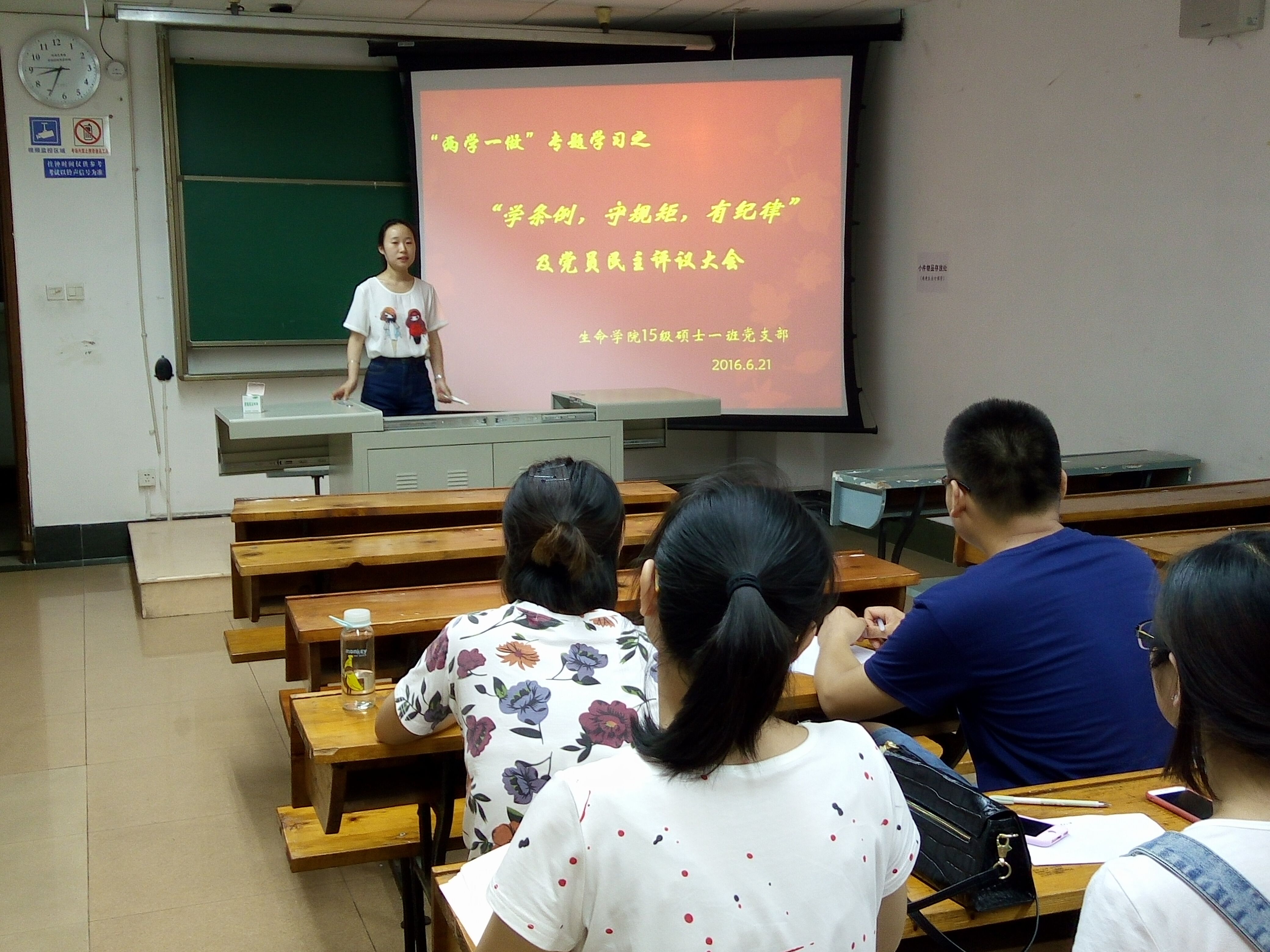 6月21日晚上,15级硕士1班党支部 “两学一做”第二阶段 “学条例、讲规矩、有纪律”专题学习会议在九里4304B召开,会议由支部书记李祯主持,支部全体党员参加。会议特别邀请到支部指导老师贺妍出席并讲党课。