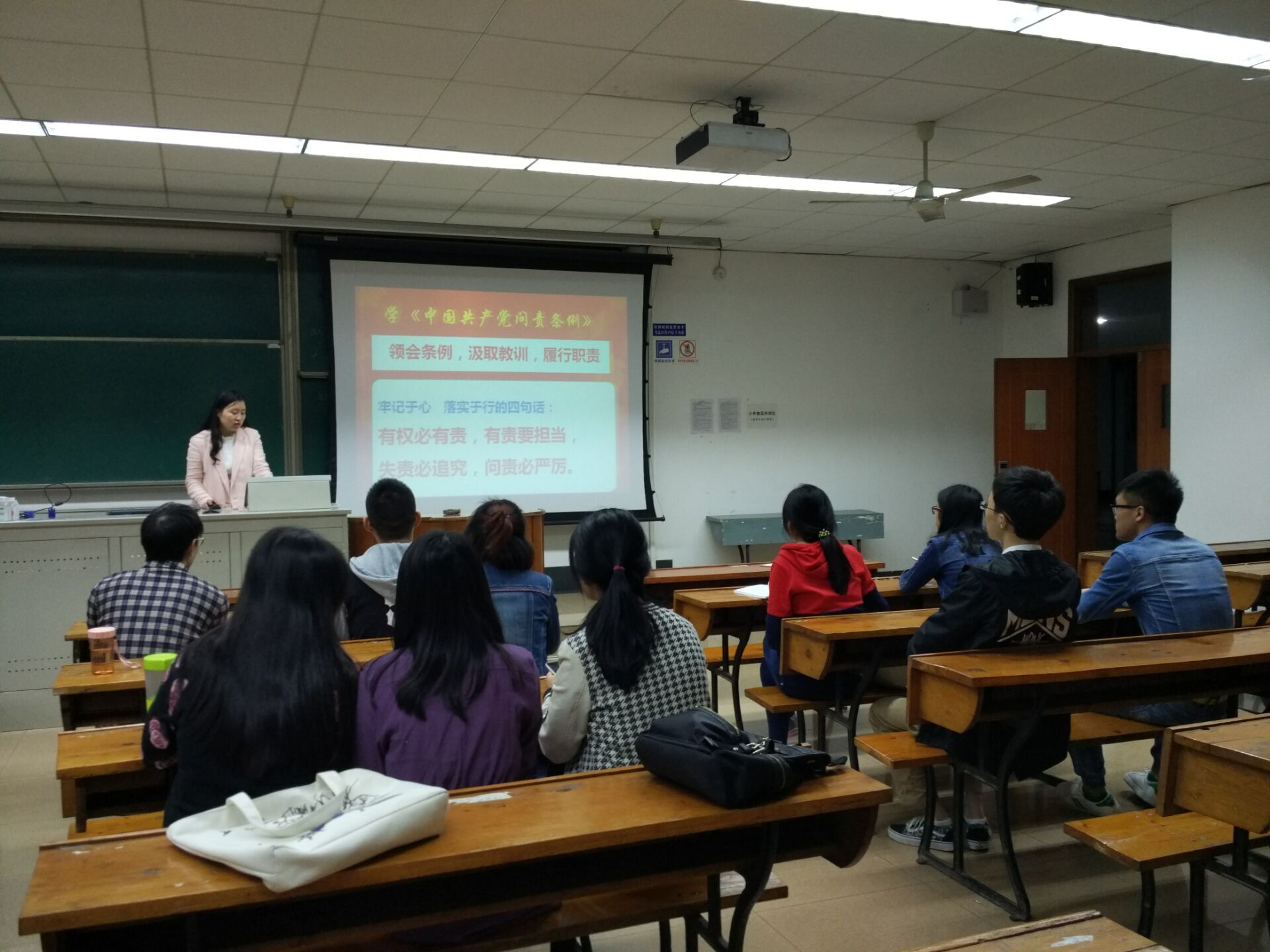 首先,由主持人、支部书记徐瑶同志带着大家以文件的形式学习了“中国共产党问责条例”。通过学习,大家明确了党的问责工作是以马克思列宁主义、毛泽东思想、邓小平理论、“三个代表”重要思想、科学发展观为指导;遵循依规依纪、实事求是,失责必问、问责必严,惩前毖后、治病救人,分级负责、层层落实责任的原则,要求每个党员都要做到有权必有责、有责要担当、失责必追究,并必须落实党组织管党治党的政治责任,督促党的领导干部践行忠诚干净担当。