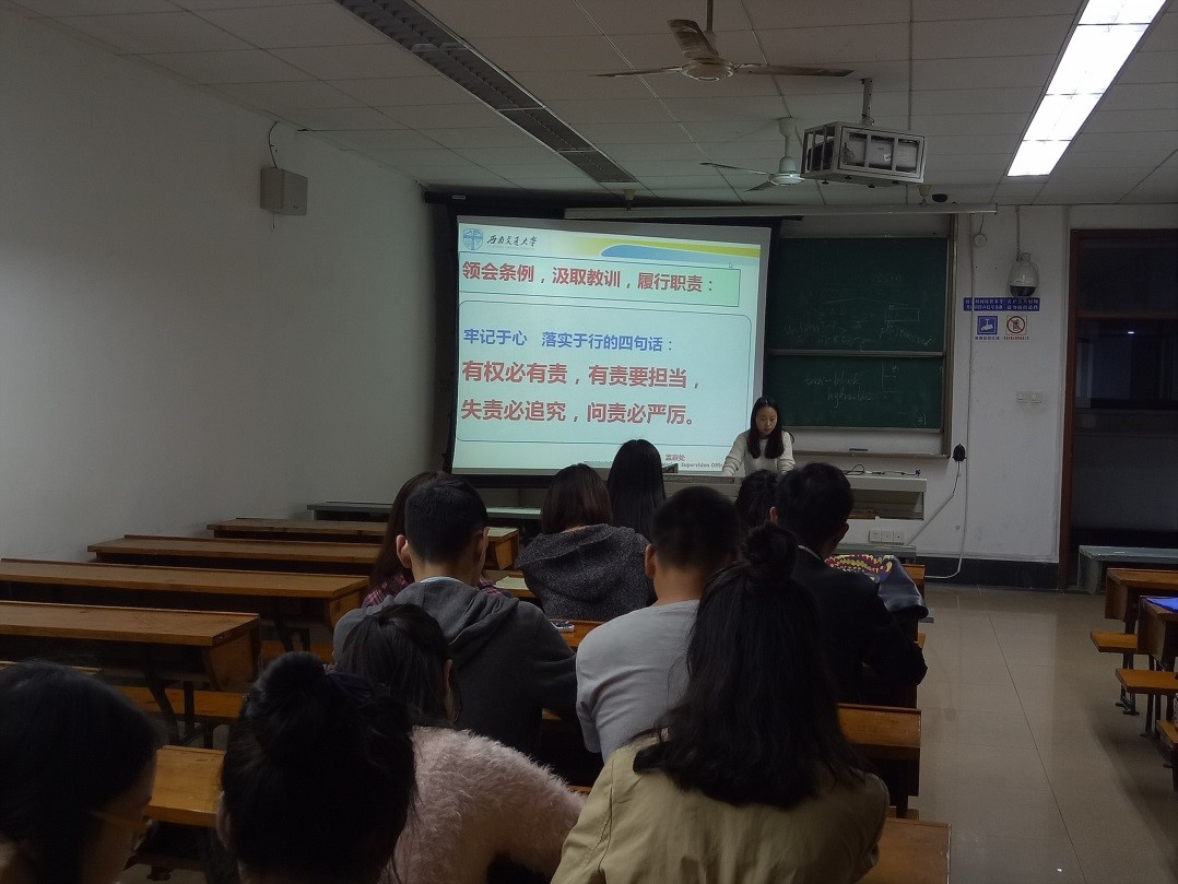 首先由支部书记李祯带领全体党员通读学习《中国共产党问责条例》,并要求全体党员严格按照《条例》落实到平常学习生活中去。《条例》是又一次党内制度创新,是深入推进从严管党治党的有力举措,是确保实现“两个一百年”奋斗目标、实现中国梦的坚强保障,是对党内法规制度的补充和完善,是一次较真碰硬的制度探索,让管党治党的责任更严更实。