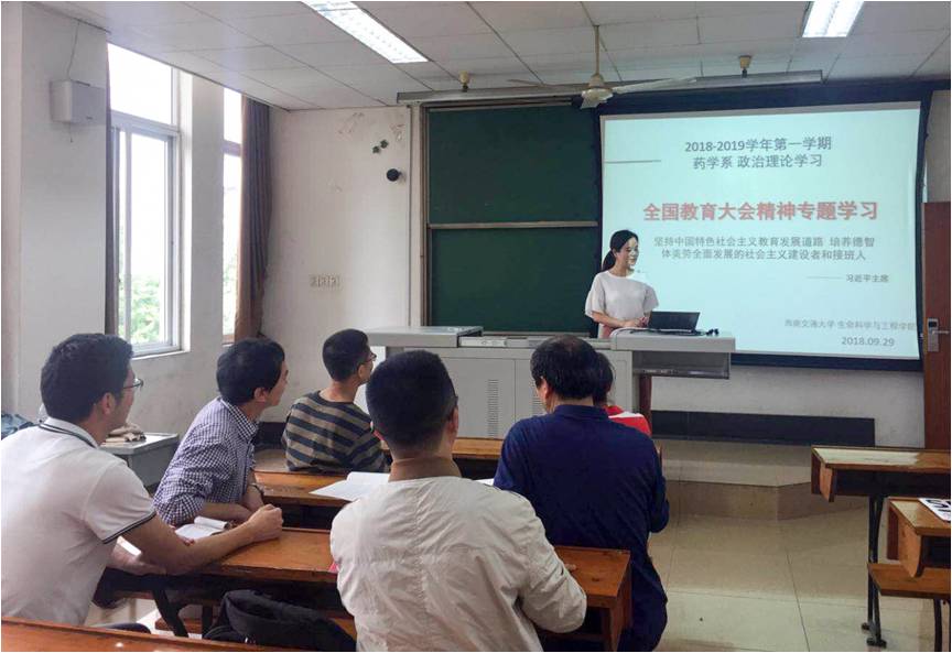 9月29日下午,药学系教工党支部在九里4419教室召开了全国教育大会精神专题学习会。会议由支部委员万瑜同志主持,支部全体党员参加了学习,党支部成员、公司党委委员闫智勇同志出席了学习会并作了交流发言。
