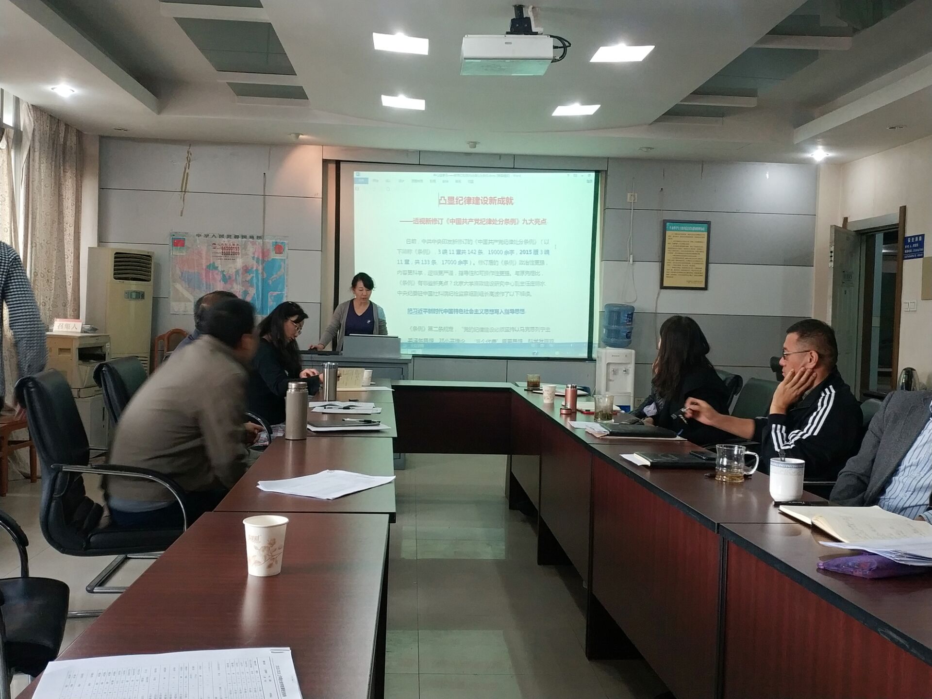 会上首先由党委委员、党务秘书贺妍同志带领与会人员集体学习了新修订的《中国共产党纪律处分条例》。贺妍同志以“凸显纪律建设新成就——透视新修订的《中国共产党纪律处分条例》九大亮点”为题,详细解读了新《条例》的修订背景、理论依托、主要内容、关键条例、突出作用和精神内涵等。接下来,专职组织员华晶晶同志带领与会人员集体学习了全国教育大会精神,着重介绍了全国教育大会的召开背景、重大意义和主要内容等。