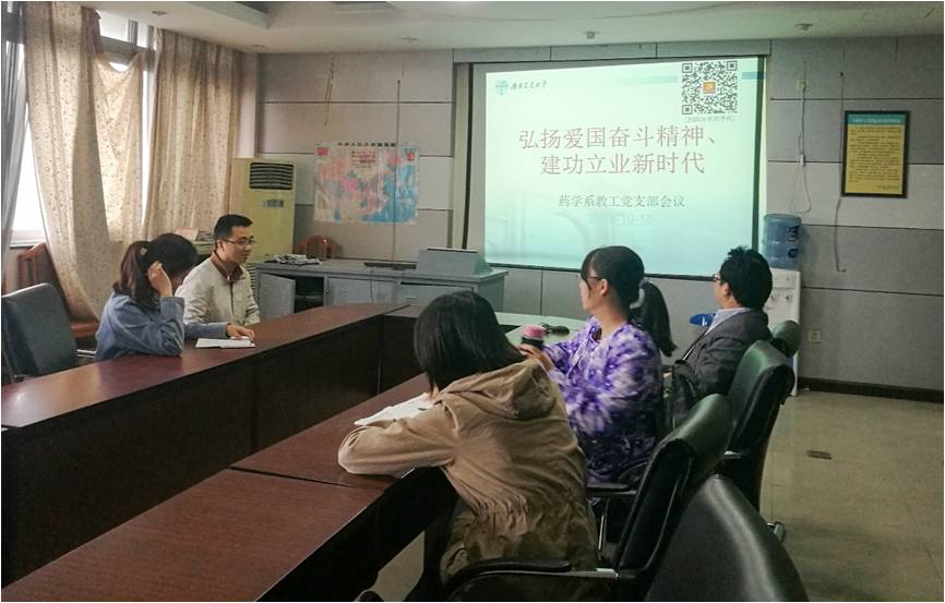 10月18日下午,药学系教工党支部在九里3609会议室开展了以“弘扬爱国奋斗精神、建功立业新时代”为主题的党日活动。活动由支部委员陈伟同志主持,党支部成员、公司党委委员高峰同志出席了学习会并作了交流发言。