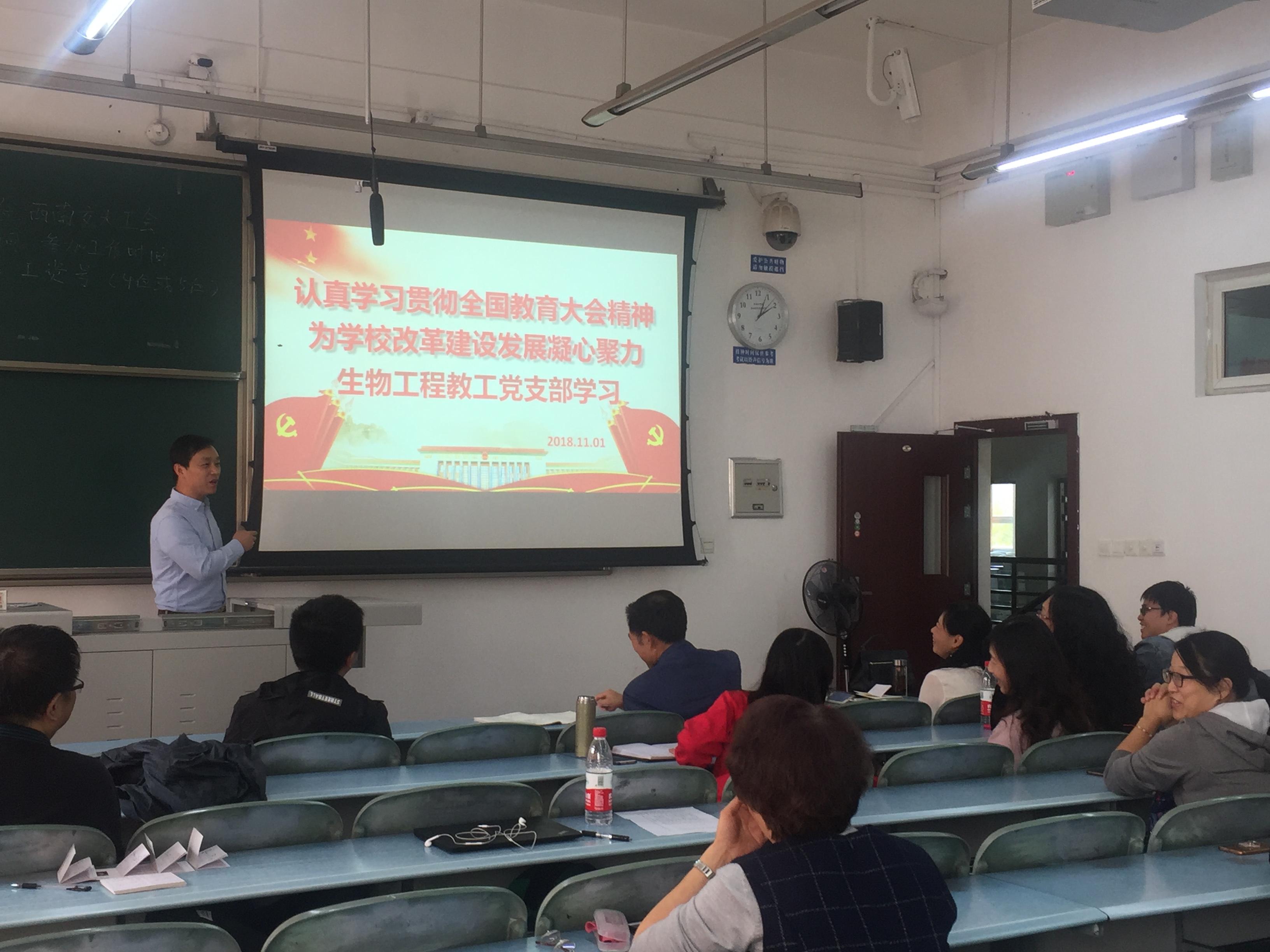 111日下午,生物工程系教工党支部在犀浦校区X2326教室开展“认真学习贯彻全国教育大会精神,为公司改革建设发展凝心聚力”主题党日活动。活动由支部书记孟涛同志主持,支部全体党员参会。