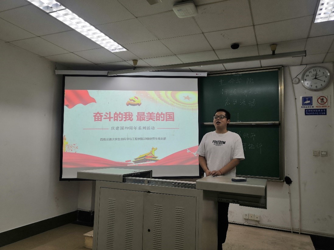 国庆假期的脚步刚刚离开,国庆的氛围却仍未消褪,我们仍然沉浸在礼炮轰鸣,队列整齐的阅兵气势中。今年是祖国的70周年华诞,每个中华儿女都怀揣喜悦和祝福为祖国母亲庆生,在这样浓烈的爱国热情感染之下,三亿2019级研究生党支部也顺势开展了“奋斗的我,最美的国”的教育活动。活动于10月8日下午16:00在教室J4305a开展,此次活动由党支部书记吴京川同志主持。