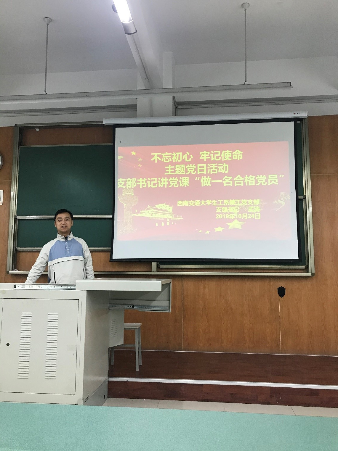 10月24日下午14:00,生工系教工党支部书记孟涛同志在犀浦校区4156为全支部党员同志讲党课。他首先谈到“初心”体现本质属性、价值追求,“使命”体现历史担当、奋斗目标。我们党的初心和使命,是党的先进性和纯洁性的集中体现,是激励一代代中国共产党人前赴后继、英勇奋斗的根本动力。“不忘初心、牢记使命”,既是马克思主义的逻辑起点,也中国共产党人的实践起点。马克思与恩格斯在《共产党宣言》中强调“过去的一切运动都是少数人的,或者为少数人谋利益的运动。无产阶级的运动是绝大多数人的,为绝大多数人谋利益的独立的运动。”正是带着这样的初心与信仰,中国老一辈无产阶级革命家在探索救国图存的道路上高举马克思主义的伟大旗帜,为着人民的利益,踏着英雄的身躯和血迹前行。回顾过往百年风雨,我们始终铭记在经历一场场浴血奋战,一次次转危为安后,坚忍不拔的中国共产党才能在夹缝中发展壮大,推翻“三座大山”,建立社会主义国家。