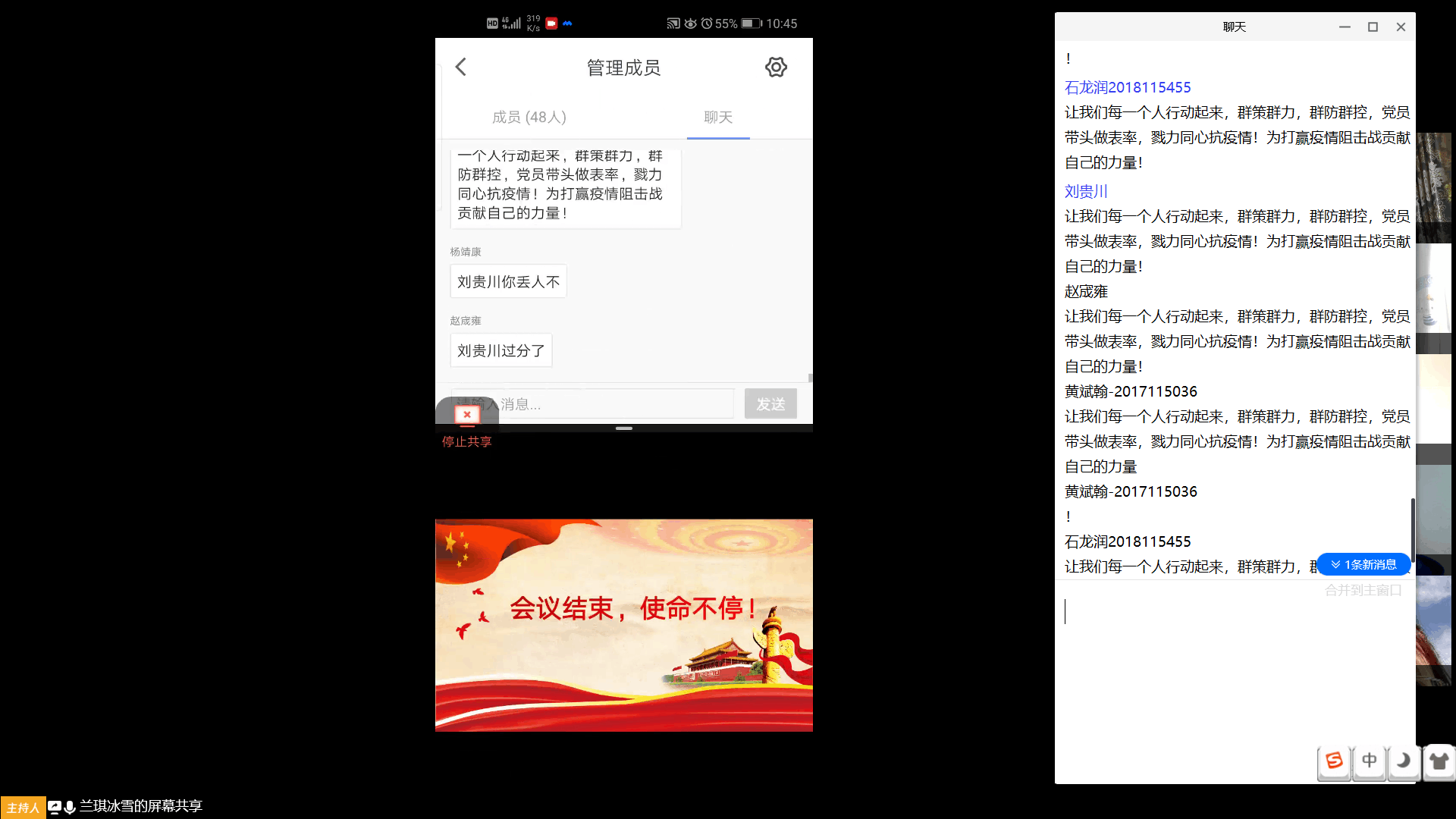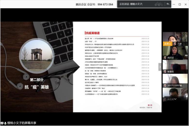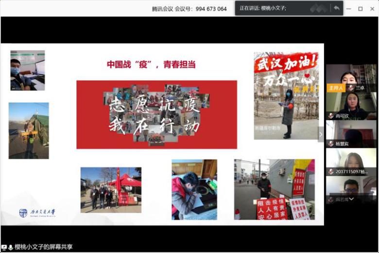随后,在下一环节中,同学们纷纷发言,分享自己和身边人在抗“疫”期间的事迹。郝博新同志分享了身边朋友在疫情期间挺身而出,参与抗战一线工作的感动;王溢滟同志分享了自己在家乡担当志愿者的所作所为,希望为家乡的抗疫工作贡献自己的一份力量;尚可欣同志作为身处美国亚特兰大的职工,分享道:中国大使馆积极组织协调,与亚特兰大四所公司的中国员工会取得联系,为在美职工发放防疫物资,尚可欣同志深切感谢到我国对于职工的关心,并为作为一个中国人而感到自豪。不管身处何处,国家永远是我们的依靠。