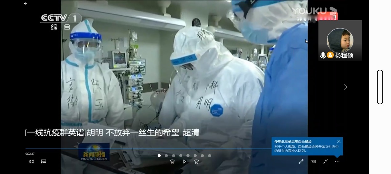 接着,杨程硕同志带领支部成员认真学习王兵、冯效林、江学庆、刘智明、李文亮、张抗美、肖俊、吴涌、柳帆、夏思思、黄文军、梅仲明、彭银华、廖建军这14名牺牲在新冠肺炎疫情防控一线的战士和武汉市肺科医院ICU主任胡明的先进事迹,并观看了视频《这个春天,你还在我身旁,不曾离去》。大家深受感动,表示疫情“逆行者”舍小家为大家,是时代的骄傲,是国家的骄傲,是民族的骄傲。他们用实际行动贡献自己的力量,这样的付出与牺牲,我们要永远的铭记。