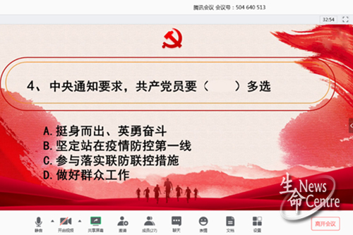 10月15日16:00,三亿本科制药工程党支部主题党日活动“青春的我,信仰的光”在X6423顺利开展,会议内容为学习国务院新闻办公室6月7日发布的《抗击新冠肺炎疫情的中国行动》白皮书以及《中国共产党的九十年》摘录,感受党在1949年至1976年的历史性巨大成就。学习结束后,支部成员共同参与了新冠肺炎疫情防控知识答题竞赛。此次活动由向玉清同志主持,8名支部成员参加活动。