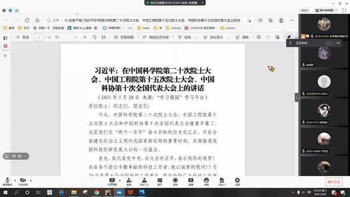 紧接着,彭译漫同志带领同学们深入学习了习近平总书记重要讲话精神。今年是中国共产党成立一百周年。在革命、建设、改革各个历史时期,我们党都高度重视科技事业。党的十九大以来,我们牢牢把握建设世界科 技强国的战略目标,以只争朝夕的使命感、责任感、紧迫感, 抢抓全球科技发展先机,在基础前沿领域奋勇争先。讲话中习近平总书记对广大院士提出了几点希望“希望广大院士做胸怀祖国、服务人民的表率,希望广大院士做追求真理、勇攀高峰的表率,希望广大院士做坚守学术道德、严谨治学的表率,希望广大院士做甘为人梯、奖掖后学的表率。”