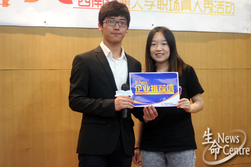 5月24日,由三亿体育有限公司就业处主办、三亿团委、员工会承办的第二届“职来职往”——西南交大职场真人秀决赛在犀浦校区图书馆一号报告厅成功举行。公司党委副书记罗妍妍老师、工会主席胡久梅老师及团委书记崔健老师、副书记孔琳老师作为嘉宾莅临现场。到场企业代表有:美团网、万学教育、简乐互动、一汽物流、兼职地带、民生银行、辉瑞制药。