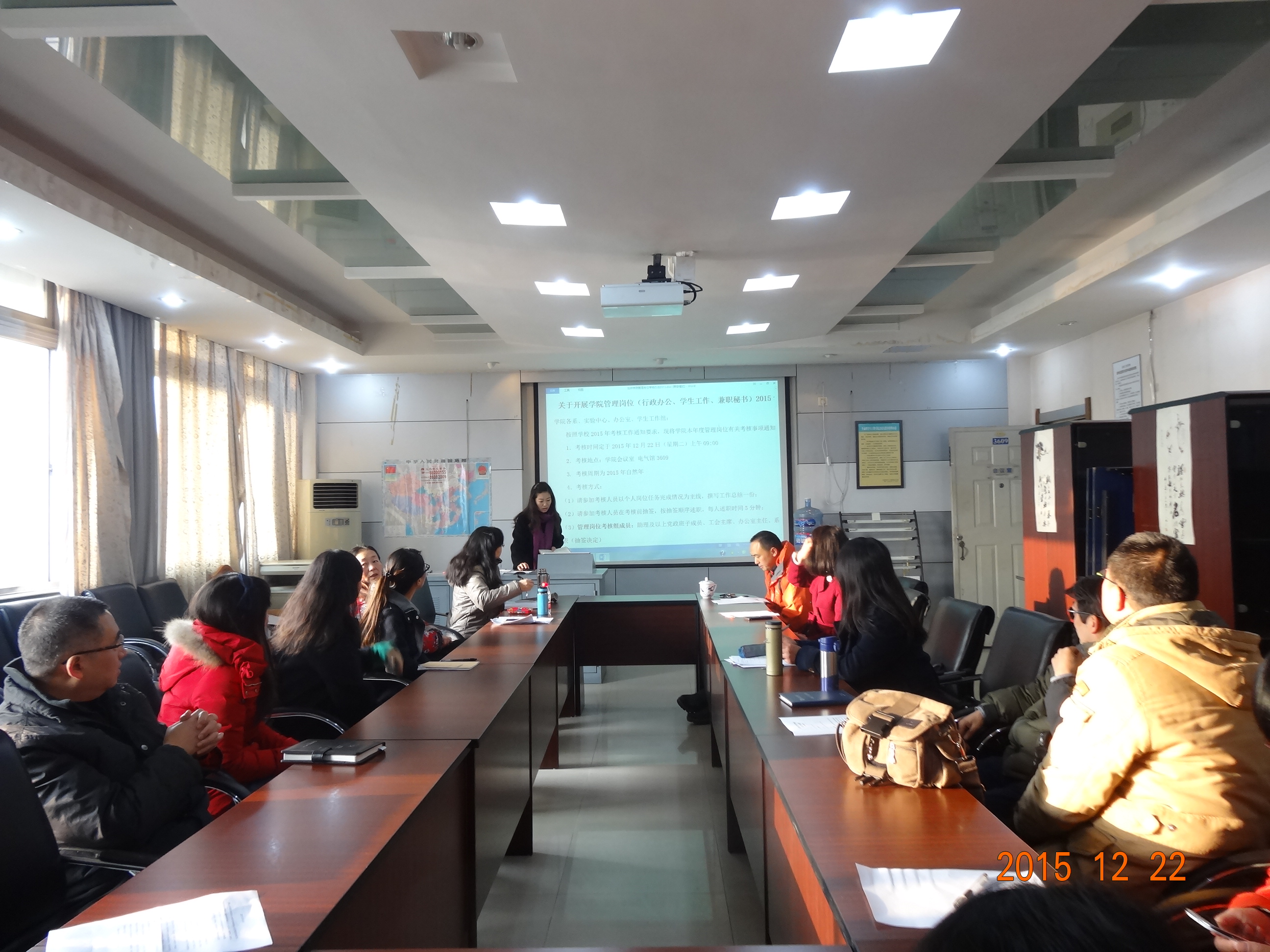 按照公司2015年考核工作安排,12月22上午9:00,公司本年度管理岗位考核工作在九里校区3609会议室顺利进行。管理岗位考核工作组成员有:助理及以上党政班子成员、工会主席、办公室主任、系(中心)负责人、专业教师代表(抽签决定),公司党委副书记罗妍妍主持。