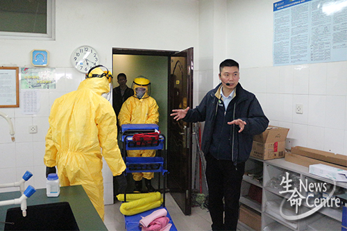 危险化学品安全管理知识讲解完毕后,在屈老师的指挥下,实验室有毒化学药品泄漏应急措施的模拟演练随之开始。一名同学因化学药品“泄漏”受伤,危害发生后,实验员工第一时间逃生并呼喊,专业人员随即赶到现场对“受伤”同学进行治疗并处理事故,实验室人员立即从最近的安全出口有序撤离现场,演练过程进行得有条不紊。