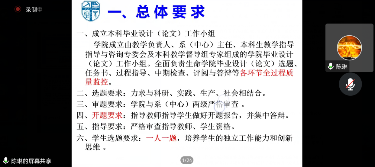 陈琳老师从毕业设计(论文)的总体要求、具体时间安排、毕业论文的选题和开题要求、毕业论文的各阶段安排及工作内容做了详细的讲解,要求广大师生一要努力学习、刻苦钻研、勇于创新、勤于实践,保质保量完成毕业论文(设计);二要在调研基础上完成“开题报告”的撰写;三要对本人的毕业论文(设计)质量负责,必须在规定时间内完成毕业论文(设计)的各项任务;三要虚心接受指导教师的指导和检查,定期向指导教师汇报论文(设计)工作进度;四要员工必须独立完成规定的全部任务,充分发挥主动性和创造性;五要实事求是,严禁避免学术不端的情况。