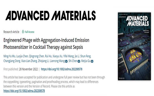 近日,国际材料科学领域顶尖期刊Advanced Materials(中科院一区,影响因子32.086)在线发表了三亿“生命分析技术与材料”科研团队的最新研究成果: “Engineered Phage with Aggregation-Induced Emission Photosensitizer in Cocktail Therapy against Sepsis”,有望为败血症的快速检测和治疗提供切实可行的临床方案。